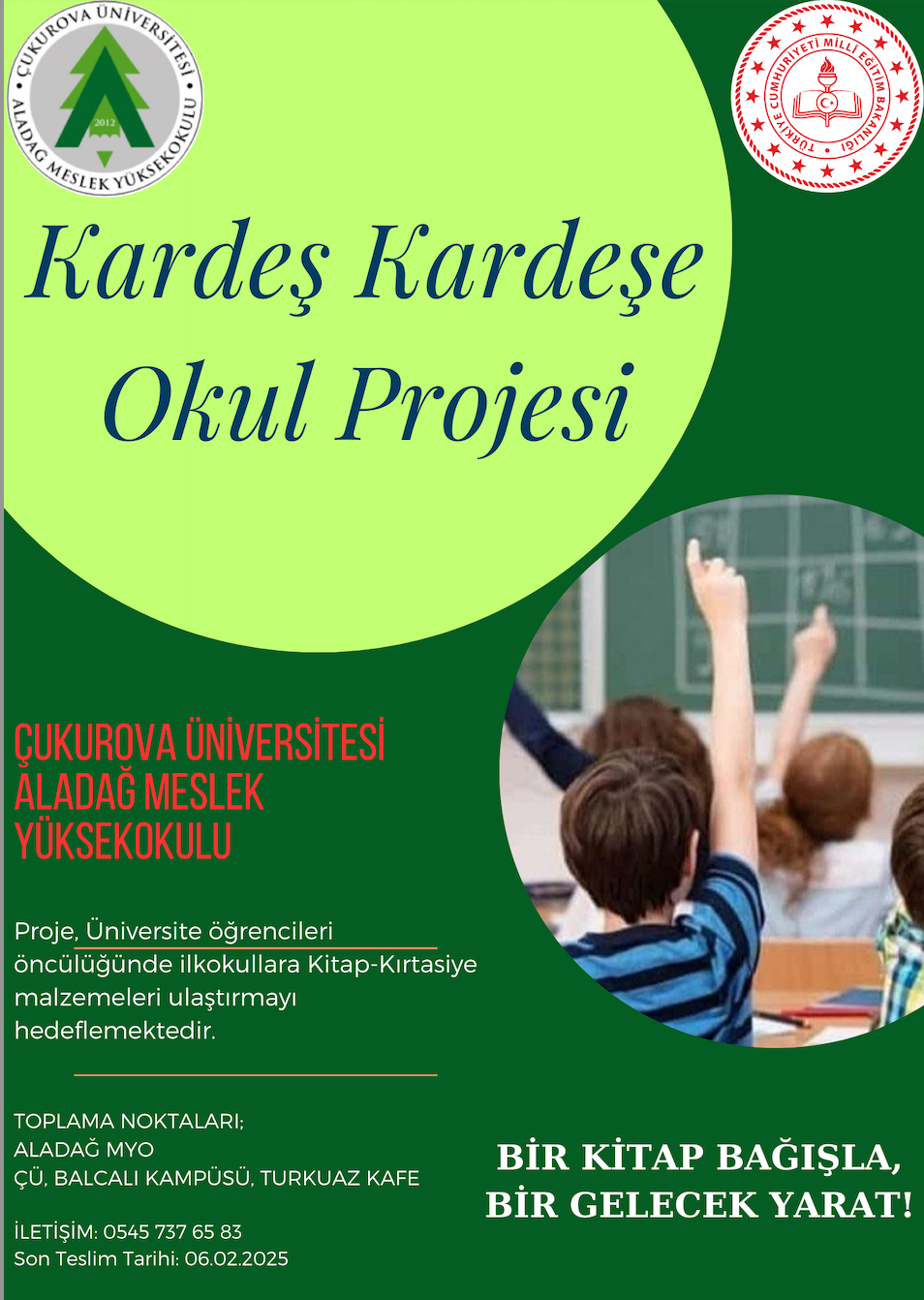 Aladağ Meslek Yüksekokulu Ormancılık Bölümü-Avcılık ve Yaban Hayatı Programı Öğrencisi Muhammed Durmuş AKKUŞ'ca başlatılan, “Kardeş Kardeşe Okul Projesi" köylerde İlköğretim okullarındaki öğrencilere kitap, defter, kalem ve silgi hediye edilecektir. Aladağ Meslek Yüksek Okulu ve Milli Eğitim Bakanlığı tarafından desteklenen projeye destek vermek isteyenler, 0545 737 65 83 no’lu telefondan daha detaylı bilgi alabilirler. Projeye kitap, defter, kalem, silgi gibi bağışların yapılasında son tarihi 06.02.2025’tir.